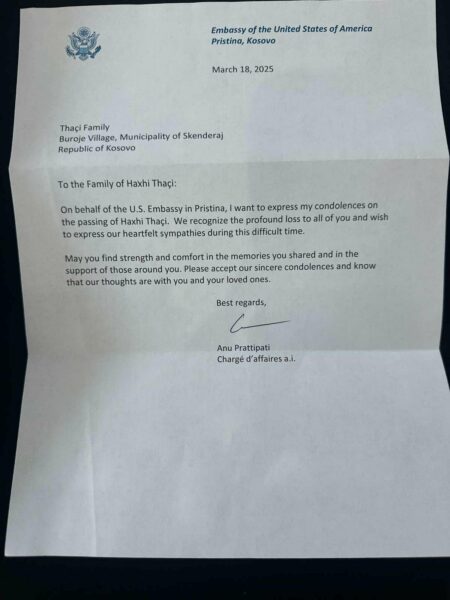 “Në emër të Ambasadës së SHBA-së në Prishtinë, dëshiroj të shpreh ngushëllimet e mia për ndarjen nga jeta të Haxhi Thaçit. Ne e kuptojmë humbjen e thellë për të gjithë ju, dhe duam t’ju shprehim ngushëllimet tona të sinqerta gjatë kësaj kohe të vështirë. Uroj që të gjeni forcë dhe ngushëllim në kujtimet që keni ndarë dhe në mbështetjen e atyre që ju rrethojnë. Ju lutemi, pranoni ngushëllimet tona të sinqerta dhe dijeni se mendimet tona janë me ju dhe të dashurit tuaj.”