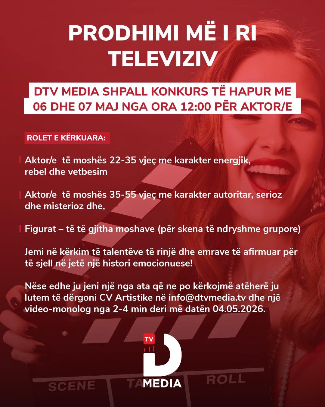 Mund të jetë një imazh i teksti që thotë "PRODHIMI ME TELEVIZIV DTV MEDIA SHPALL KONKURS Te HAPUR ME 06 DHE 07 MAJ NGA ORA 12:00 PER AKTOR/E ROLET KERKUARA: Aktor/e moshës 22-35 vjeç me karakter energjik, rebel dhe vetbesim Aktor/e e moshës 35-55 vjeç me karakter autoritar, dhe misterioz dhe, Figurat gjitha moshave (për skena Jemi nẽ körkim të sjell në jetë ndryshme grupore) talentëve rinjë dhe emrave histori emocionuese! afirmuar për Nëse edhe ju jeni një nga ata që ne po kërkojmë atëherë ju lutem dërgoni CV Artistike ne info@dtvmedia.tv dhe një nga 2-4 min deri Te datën 04.05.2026. MEDIA"