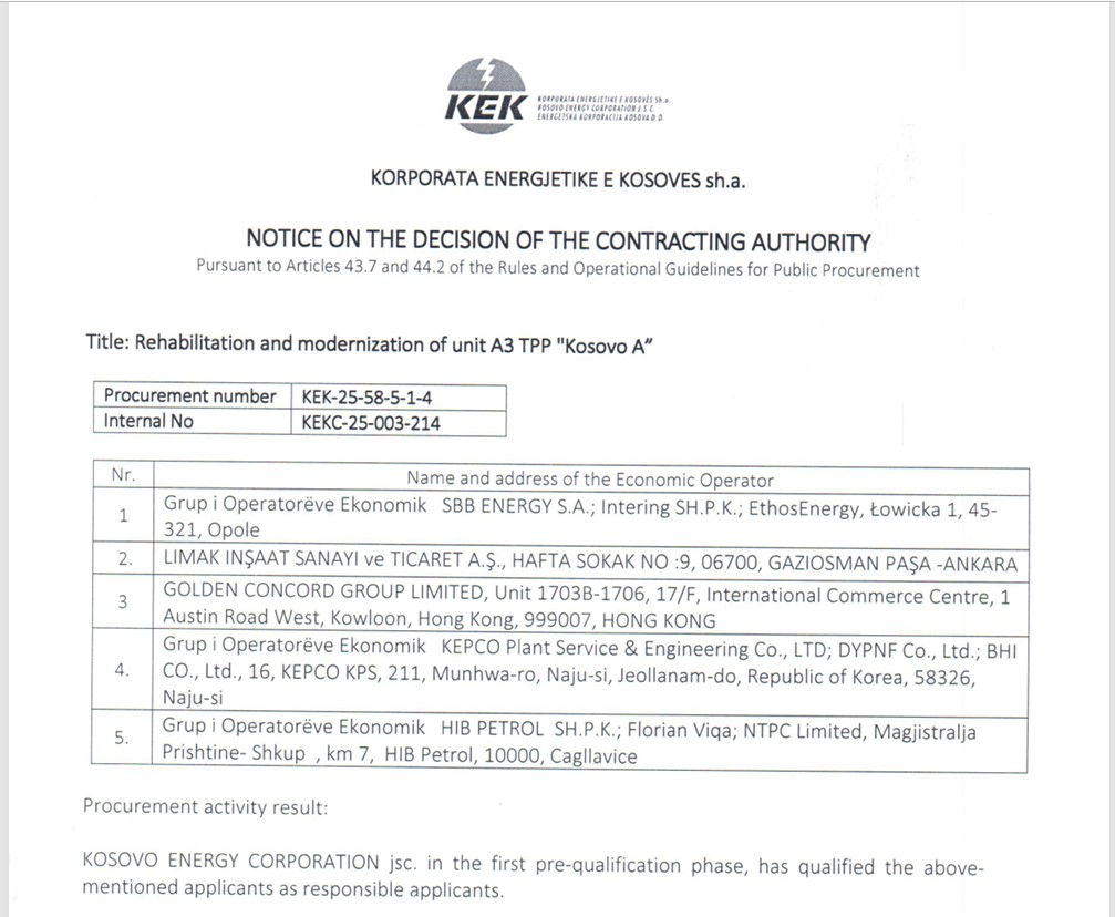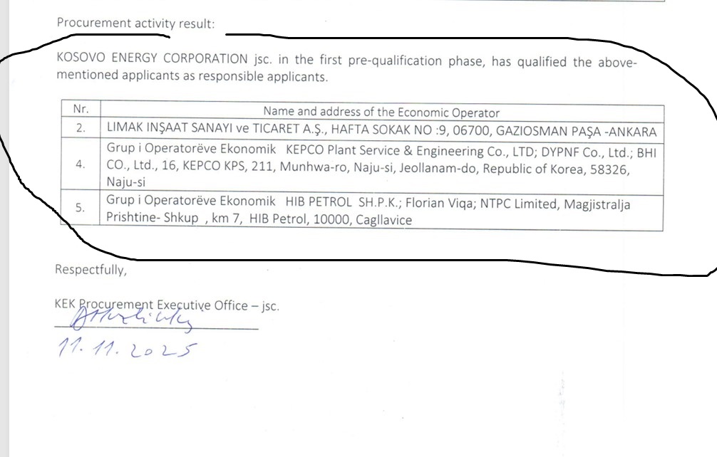 Më 11 nëntor 2025, KEK publikoi në e-prokurim njoftimin për rezultatet e fazës së parë të kualifikimit. Në listën e publikuar figurojnë vetëm tre operatorë të kualifikuar: