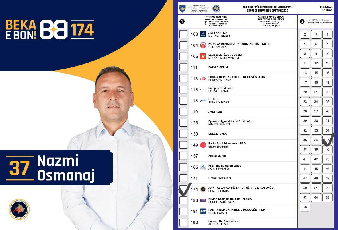 “Edhe pak ditë na ndajnë nga 12 tetori, dita e vendimit. Ju ftojmë të votoni: 🗳 Voto 174 – Bekë Berisha dhe 🗳 Voto 37 – Nazmi Osmanaj. Bashkë mund të sjellim Dritë për Prishtinën,” tha Osmanaj.