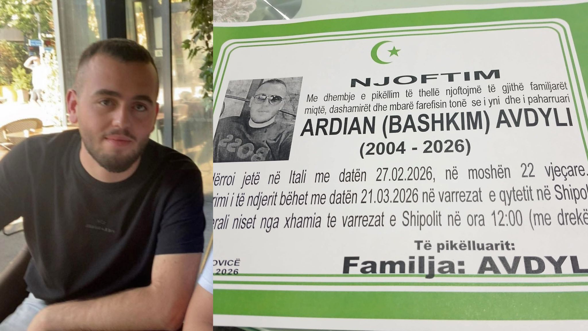 Do të varroset nesër Ardian Avdyli, 22-vjeçari i cili vdiq tragjikisht pas një aksidenti në Itali më 27 shkurt.