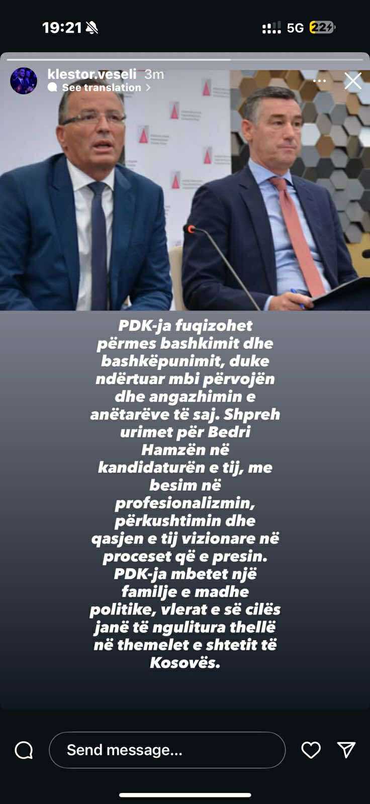Pas djalit të ish-presidentit Hashim Thaçi, Endritit, i cili dje doli në përkrahje të kandidaturës së Bedri Hamzës për Kryetar të PDK-së, tani njëjtë ka vepruar edhe djali i Kadri Veselit, Klestori.