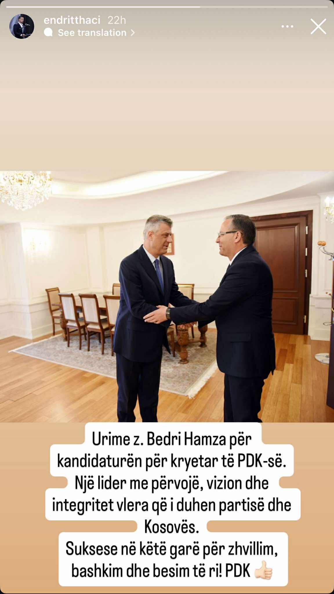 Edhe djali i Thaçit, Endrit Thaçi, dje e ka uruar Bedri Hamzën për kandidaturën e tij për kryetar të PDK-së.