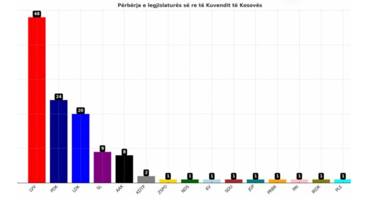 Lëvizja Vetëvendosje do të zë më së shumti ulëse, 48, në legjislaturën e nëntë të Kuvendit të Kosovës, derisa një ulëse të rezervuar për komunitetin serb do ta ketë edhe Nenad Rashiq, udhëheqës i Partisë për Liri, Drejtësi dhe Mbijetesë.